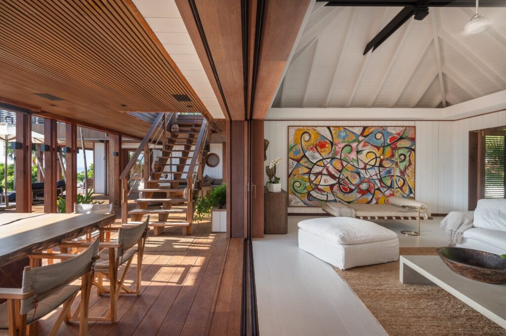 The living area offers an extremely comfortable, oversize “cloud” sofa. With the huge drop-down screen, it’s the perfect spot for movie nights. The room can be used with AC or opened on both sides for island breezes and an indoor outdoor feel.